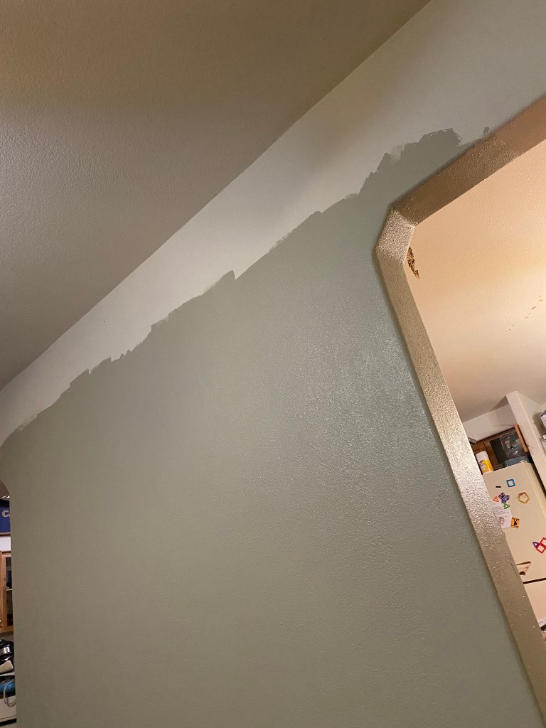 While you are at work your wife continues painting. She is not tall enough to reach the top of the wall, and you don’t own a tall ladder, so she borrows one from your father. As she is finishing up the painting in the living room she realizes that there is one whole can of paint that will be left over. She begins dreaming of painting the kitchen as well. She convinces herself to finishing one project at a time.