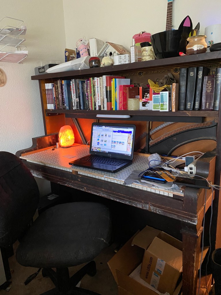 When she gets home she will look around the living room and think about how to rearrange it. She will spot the old piano that is missing a wheel and won’t hold a tune and she will convince you that it should be turned into a desk. The new desk should go into your bedroom and the old desk that was in your bedroom can be put in the son’s bedroom. So you begin taking apart the piano. The strings will go to your daughter to try and make jewelry with. The front you will save and make a corkboard or whiteboard with. Not sure yet on that one.